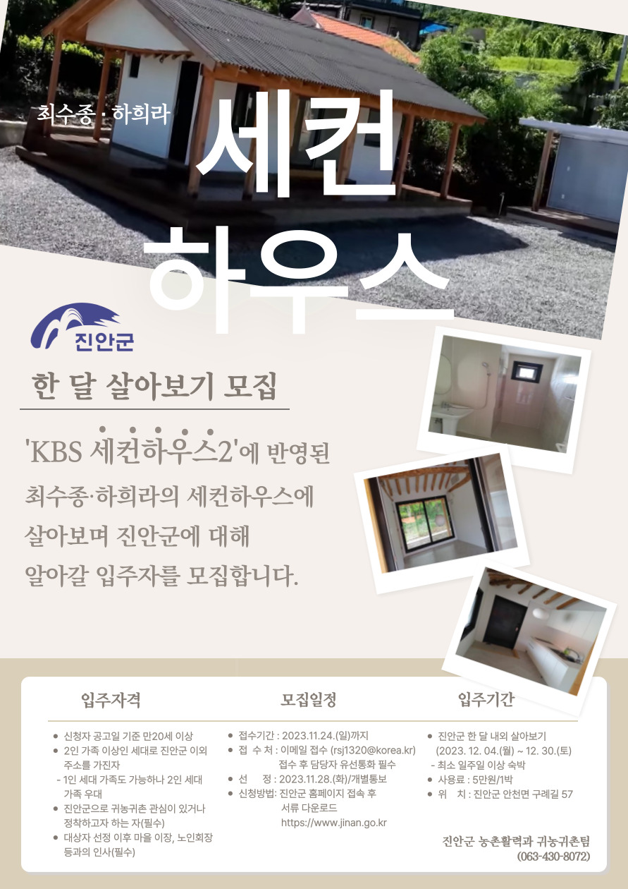 세컨하우스 살아보기 시범운영 참가자 모집 공고 저작물은 “공공누리 제2유형 : 출처표시+상업적이용금지” 조건에 따라 이용할 수 있습니다.