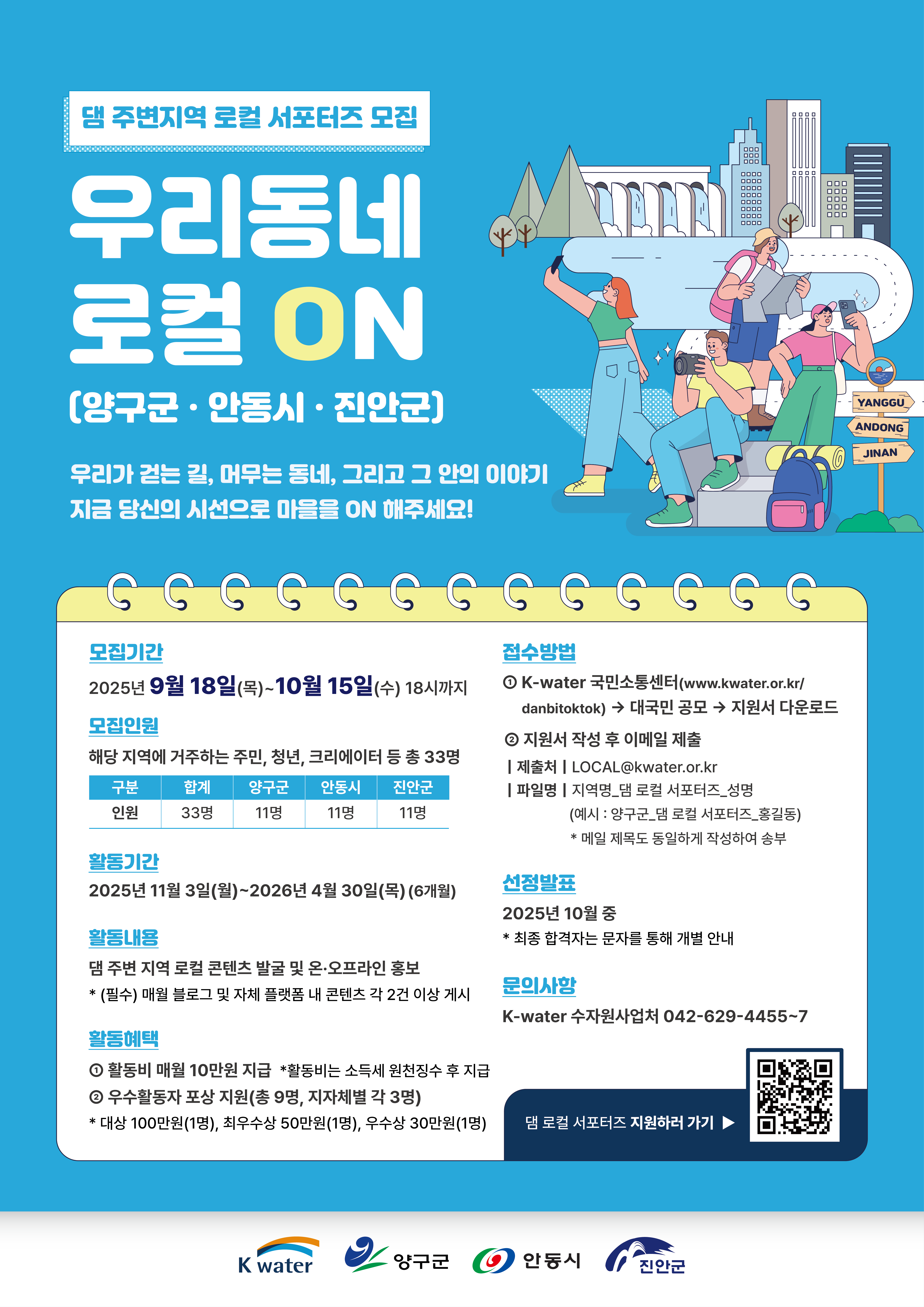 한국수자원공사에서 댐 로컬 서포터즈를 모집합니다.(진안군, 안동시, 양구군 각 11명씩 총33명)