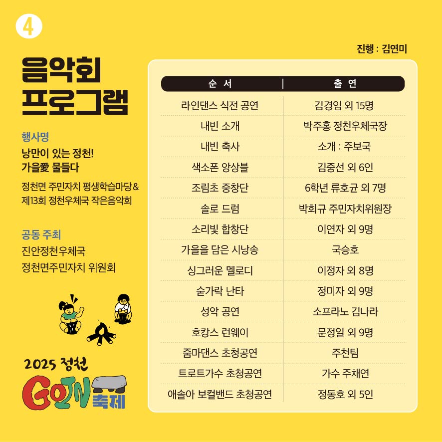 - "낭만이 있는 정천! 가을愛 물들다" 라는 주제로 오늘을 기뻐할 음악회