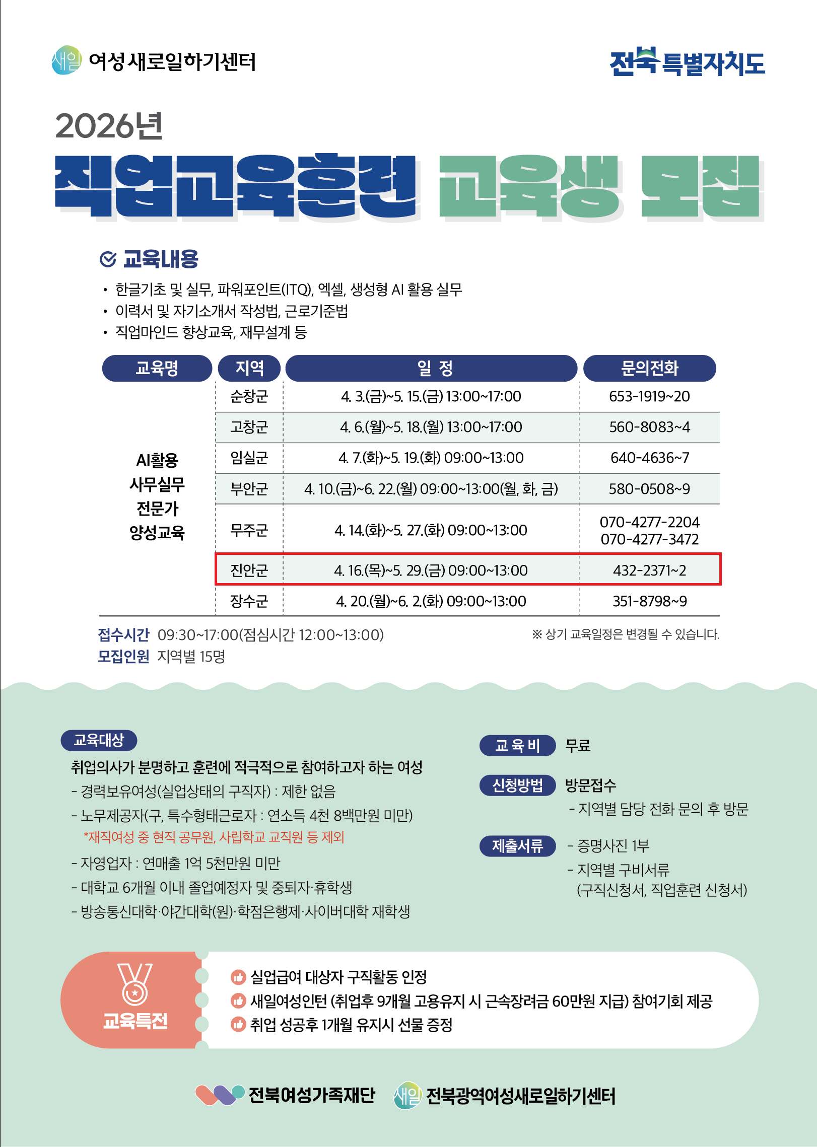 전북광역여성새로일하기센터에서 아래와 같이 2026년 직업교육훈련 교육생을 모집하오니 많은 참여 바랍니다.
