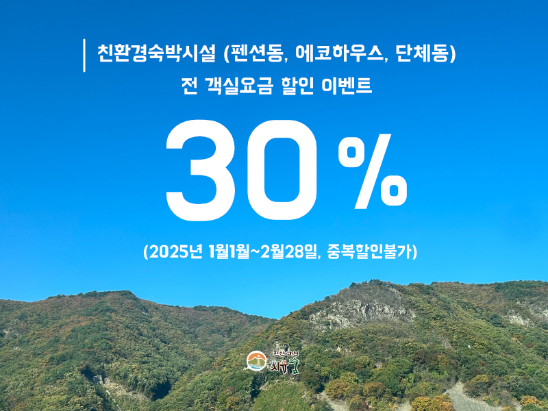 진안고원 치유숲, 동절기(2025년 1월~2월) 2달간 친환경숙박시설 (펜션동, 에코하우스, 단체동) 30% 숙박 할인 이벤트를 실시합니다.
