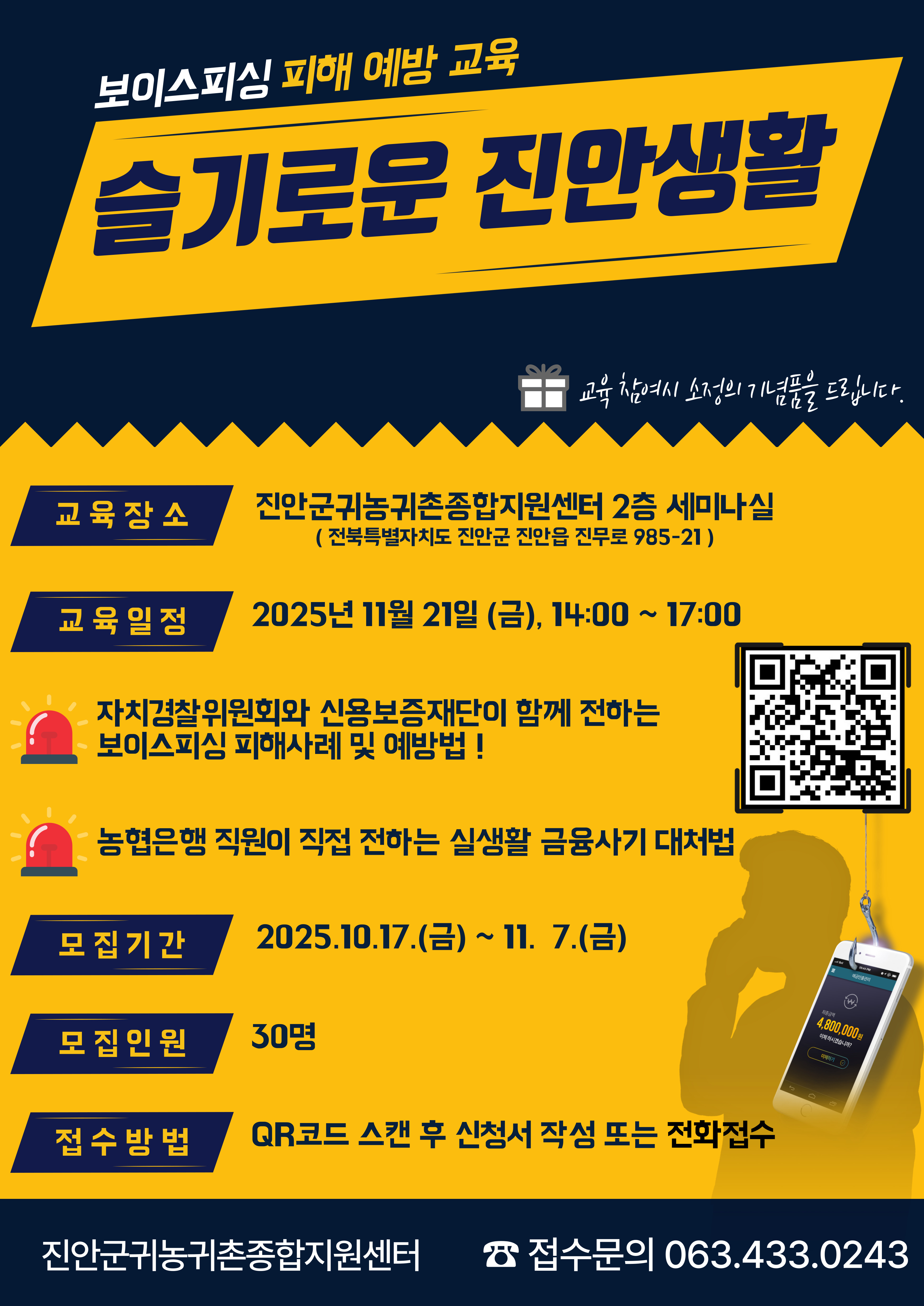 2025년 슬기로운 진안생활 참가자 모집(보이스피싱 피해 예방 교육) 저작물은 “공공누리 제4유형 : 출처표시+상업적이용금지+변경금지” 조건에 따라 이용할 수 있습니다.