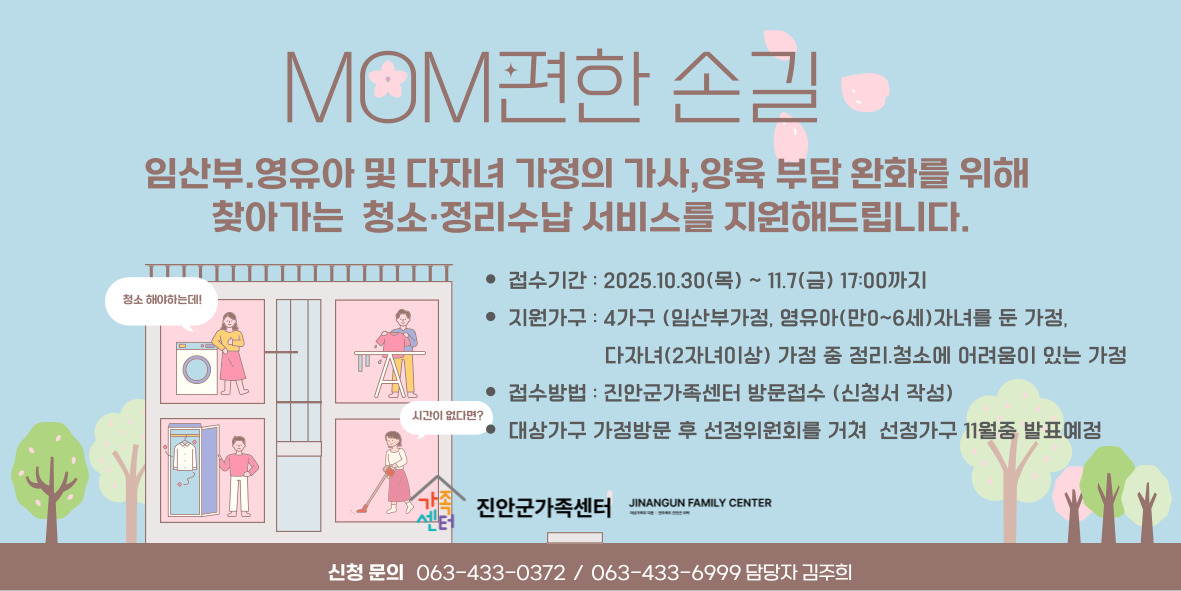 진안군가족센터 맘편한 손길( 청소정리수납 서비스) 참여자를 아래와 같이 모집하오니 많은 참여 바랍니다.