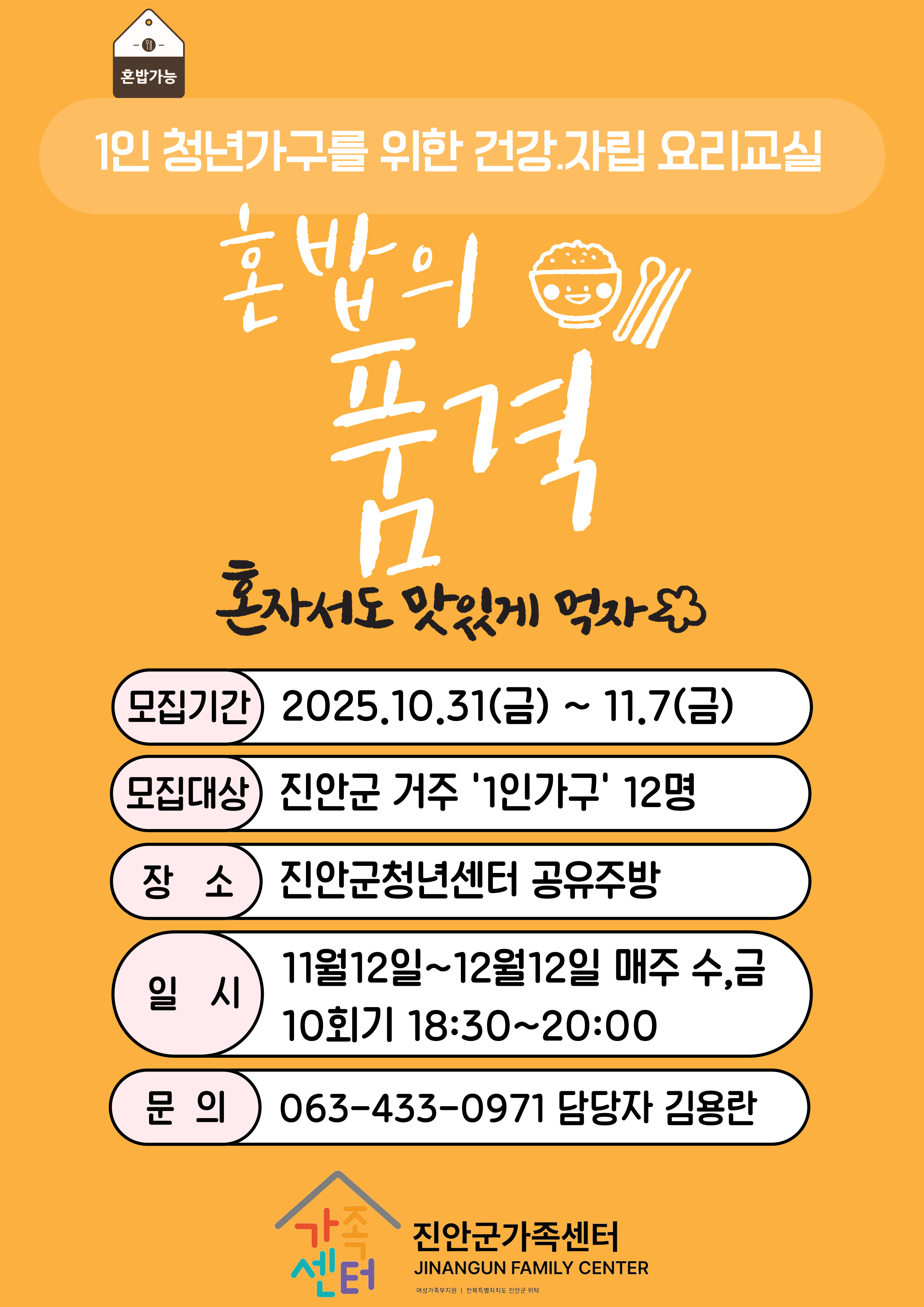 [진안군가족센터]1인 청년가구를 위한 건강,자립 요리교실 혼밥의 품격 참여자 모집 저작물은 "자유이용이 불가"합니다.