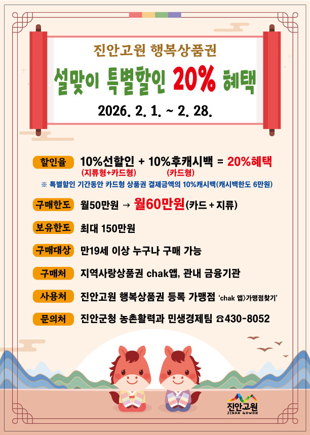 진안고원 행복상품권 설맞이 특별할인 20% 혜택 안내 저작물은 “공공누리 제4유형 : 출처표시+상업적이용금지+변경금지” 조건에 따라 이용할 수 있습니다.