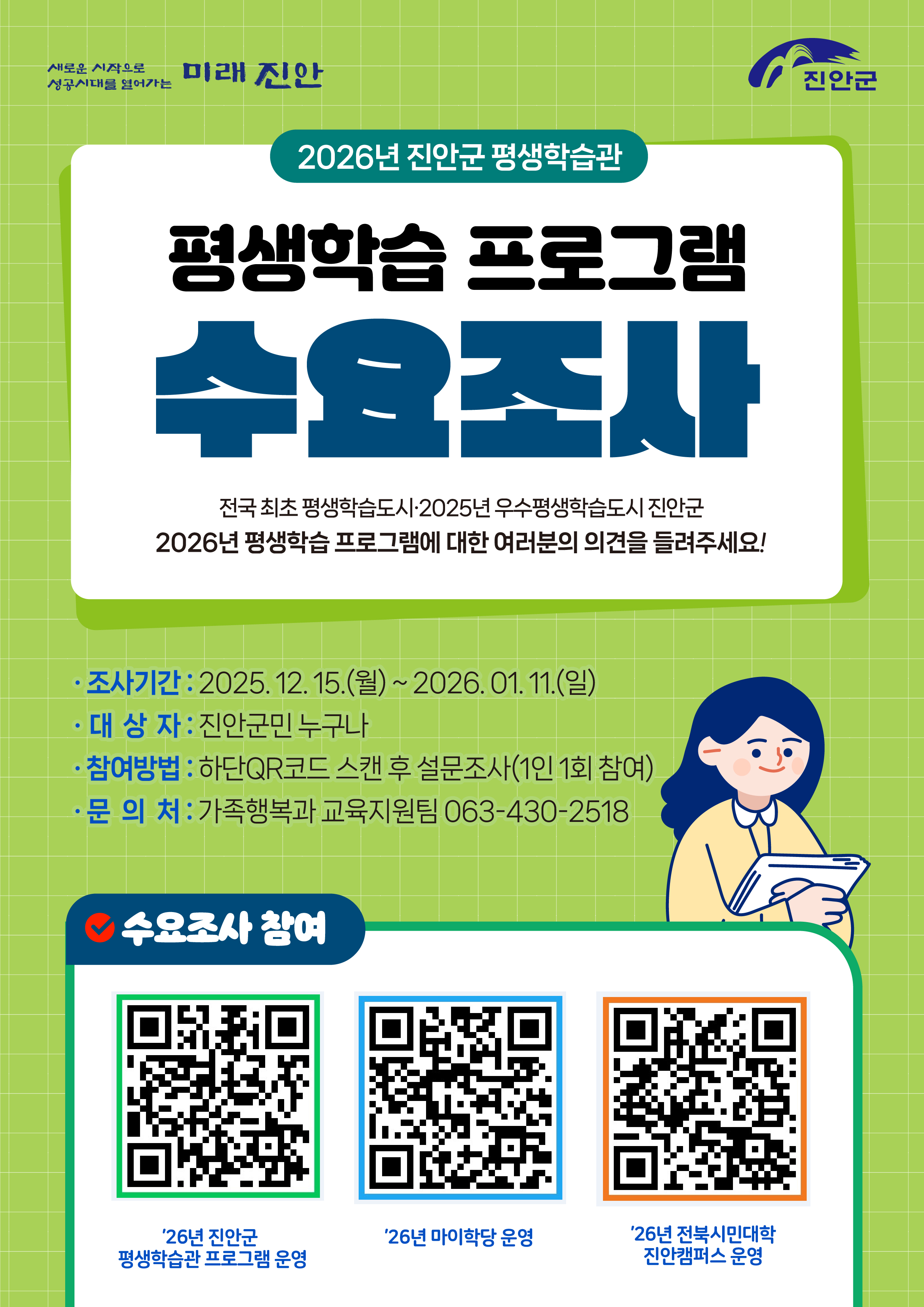 전국 최초 평생학습도시이자 2025년 교육부 우수평생학습도시로 선정된 전북특별자치도 진안군의 2026년 평생학습 프로그램 운영을 위한 수요조사를 진행합니다.  많은 관심과 참여 부탁드립니다. :)