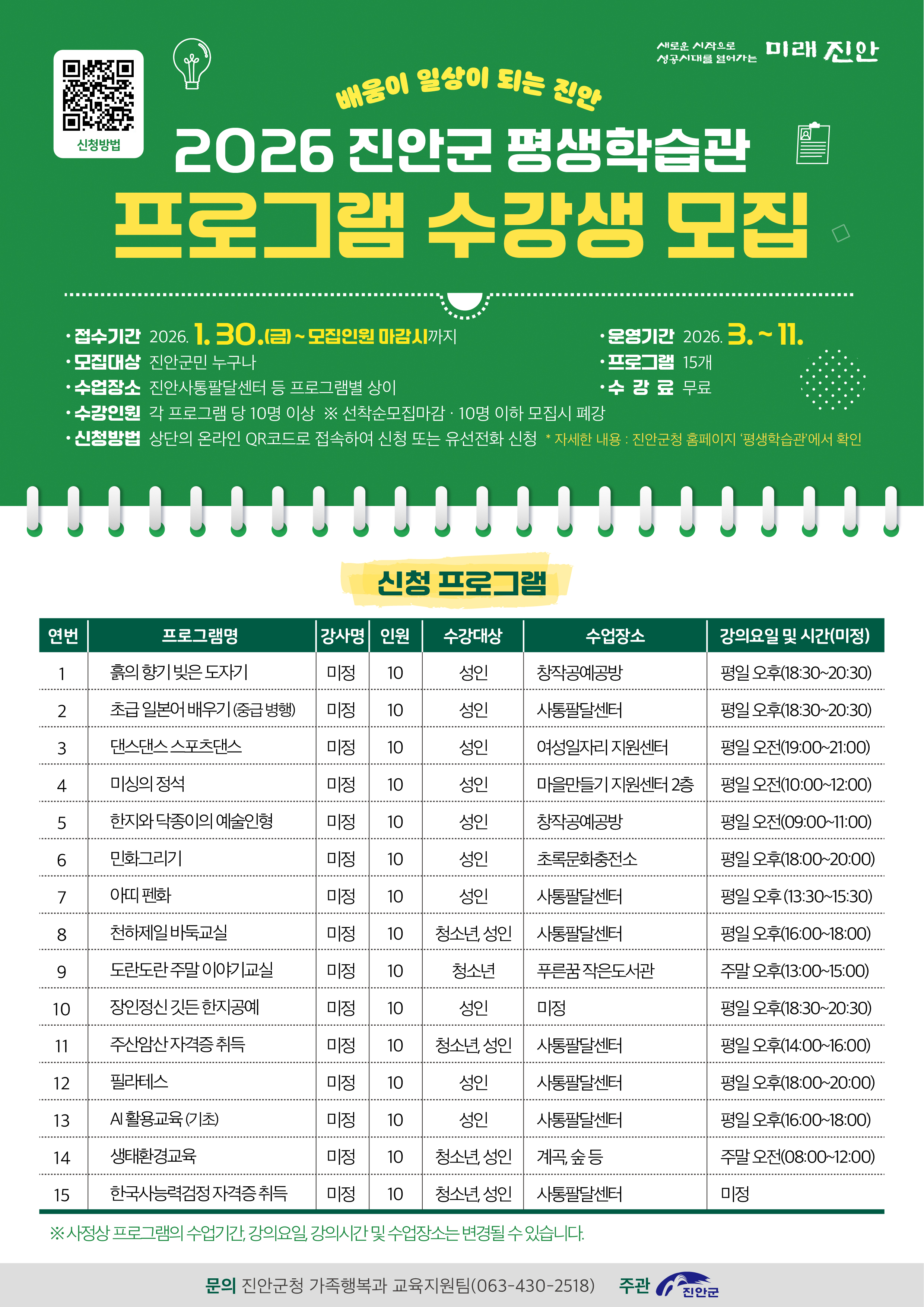 배움이 일상이 되는 진안군에서 2026년 진안군 평생학습관 프로그램에 참여할 수강생을 모집합니다.