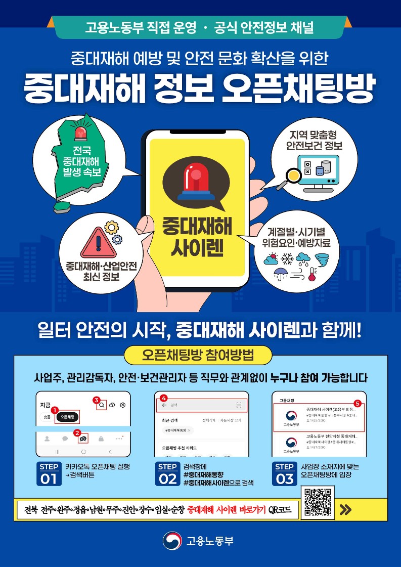 중대재해 정보 오픈 채팅방 안내 저작물은 “공공누리 제4유형 : 출처표시+상업적이용금지+변경금지” 조건에 따라 이용할 수 있습니다.