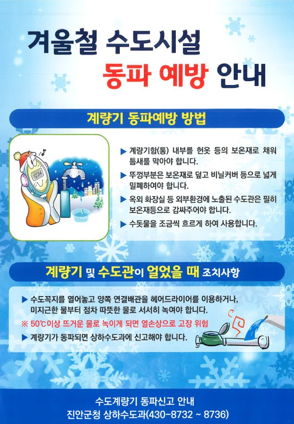 겨울철 수도시설 동파 예방을 위해 다음 안내문을 참고해주시기 바랍니다.